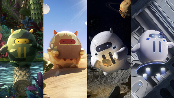 Behind the TRON-BULL is a mosaic of four adventure stories set in the rainforest, moon, desert and a cyberpunk universe, each of which symbolizes its own unique adventure for the mascot.